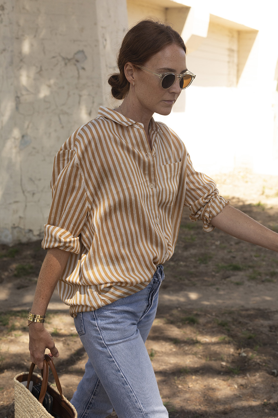 I ducked into the Jenni Kayne Montecito store recently to pick up a gift for Elin’s teacher—btw the candles are my go-to gift, always such a big hit—and discovered this striped button-down shirt. It’s become one of my favorite Jenni Kayne pieces as of late because of the perfectly oversized fit and how the luxurious fabric falls so beautifully (I’m wearing a size small). It’s something I know I’m going to live in with jeans, over bathing suits and shorts.