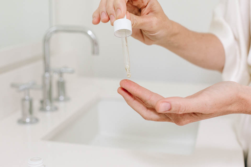 I skip my cleanser in the morning, a tip I got a few years ago if you have dry skin. Instead I rinse with cold water and dab my face dry. Then I use my Dr. Sturm Hyaluronic Serum and Dr. Sturm Calming Serum, which I love for redness in the morning, and follow up with one of the two moisturizers I use at night.