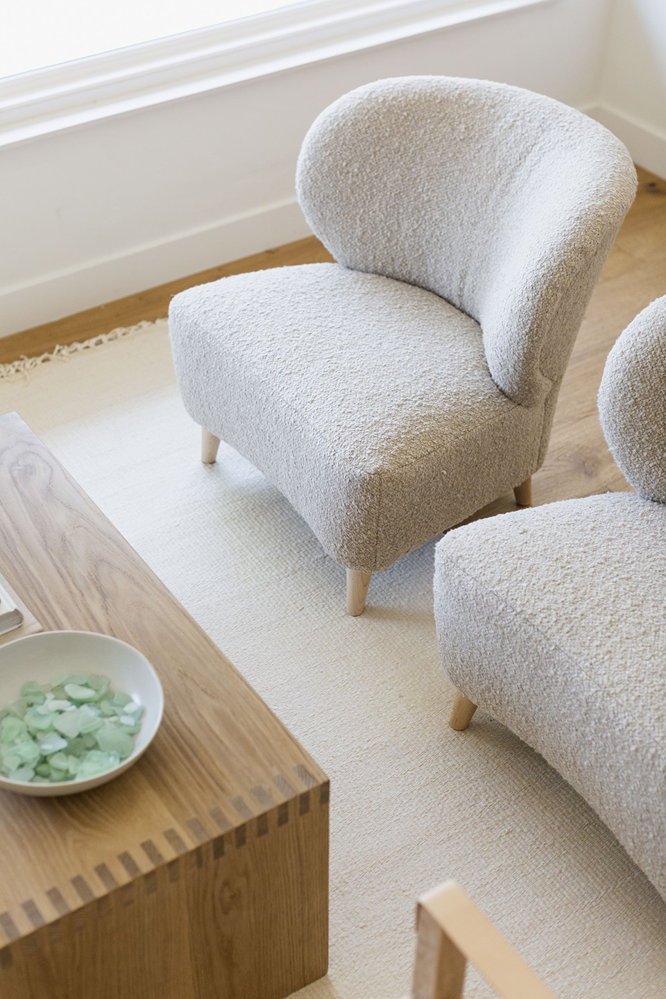 We went with the Harbor Sofa in natural linen (72”) which I’m so glad we did (almost did the ivory but the natural linen really works well with the Brentwood Boucle chairs) and the Sierra rug in natural that compliments the furniture so well. Almost every morning you’ll find us on this couch, making plans for the morning and drinking coffee and it’s one of my favorite moments of the day. Sometimes we all pile on the couch, which thanks to the depth, fits us all comfortably. The ultimate spot to lounge!