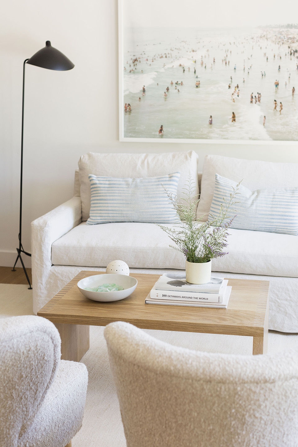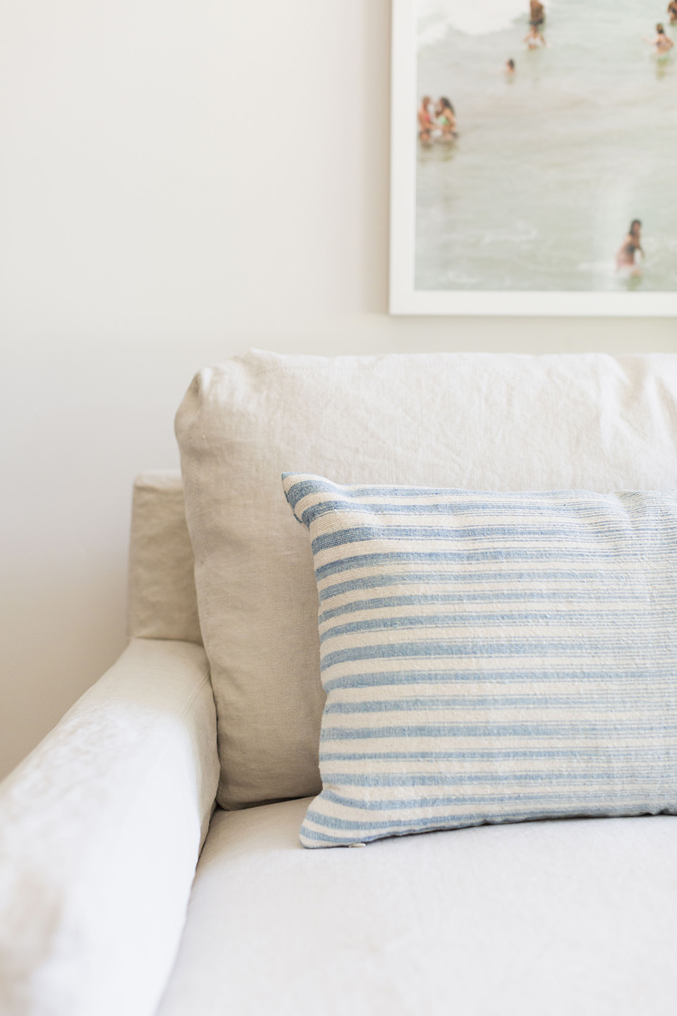 Lastly we put two blue stripe Montauk Lumbar pillows on the Harbor Sofa to play off of a beach print by Will Adler hanging above. I love this photograph because there’s a lightness to it and it feels airy just like the room. That bit of blue was the final touch that really pulled the whole space together so beautifully.