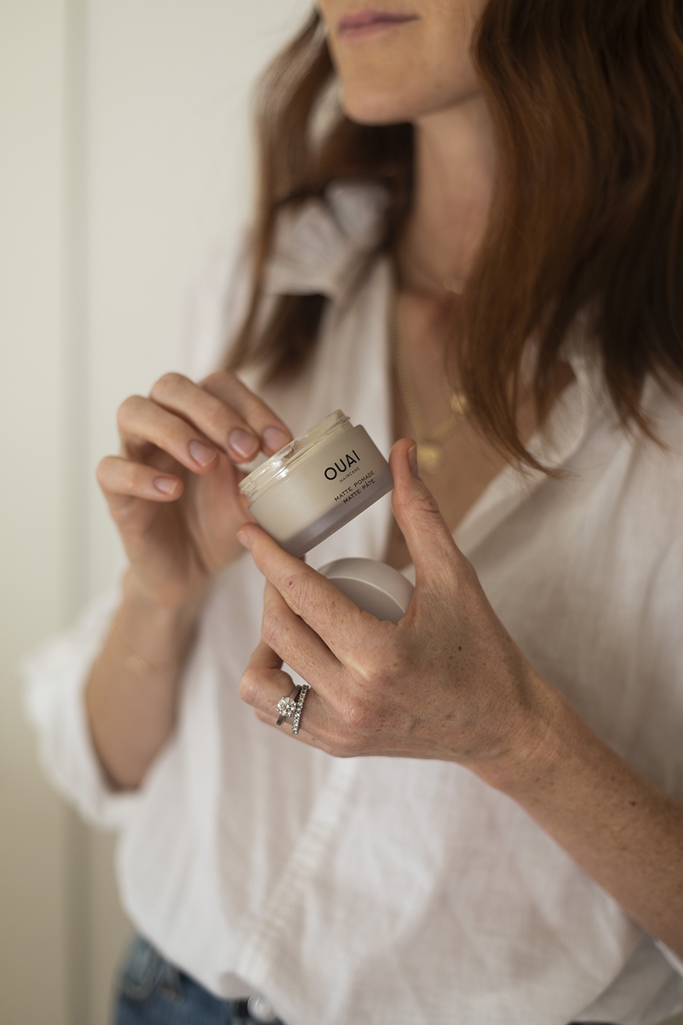Normally I’m an air dry kind of girl. Before both babies I preferred the way air drying gave my hair texture and my natural wave just worked better that way, not to mention it’s easier! You can check out my previous hair styling routine here. But now, with a layer underneath and weird short pieces in the front, it just works better if I dry the pieces with a round brush and dryer right away. They’re more manageable and easier to hide—you can check out that routine here. Also investing in some good pomade (Ouai Matte Pomade is my favorite) that isn’t too greasy will make your life ten times easier.