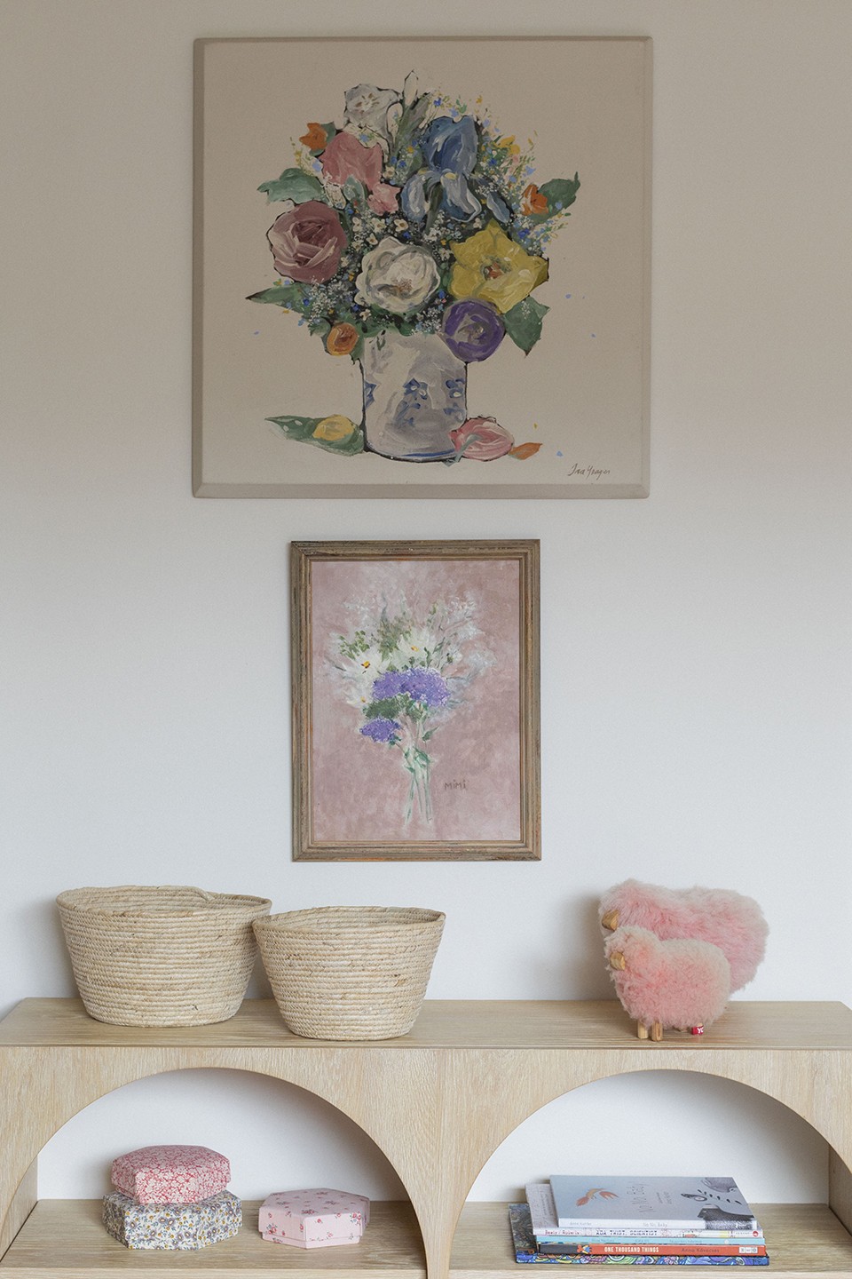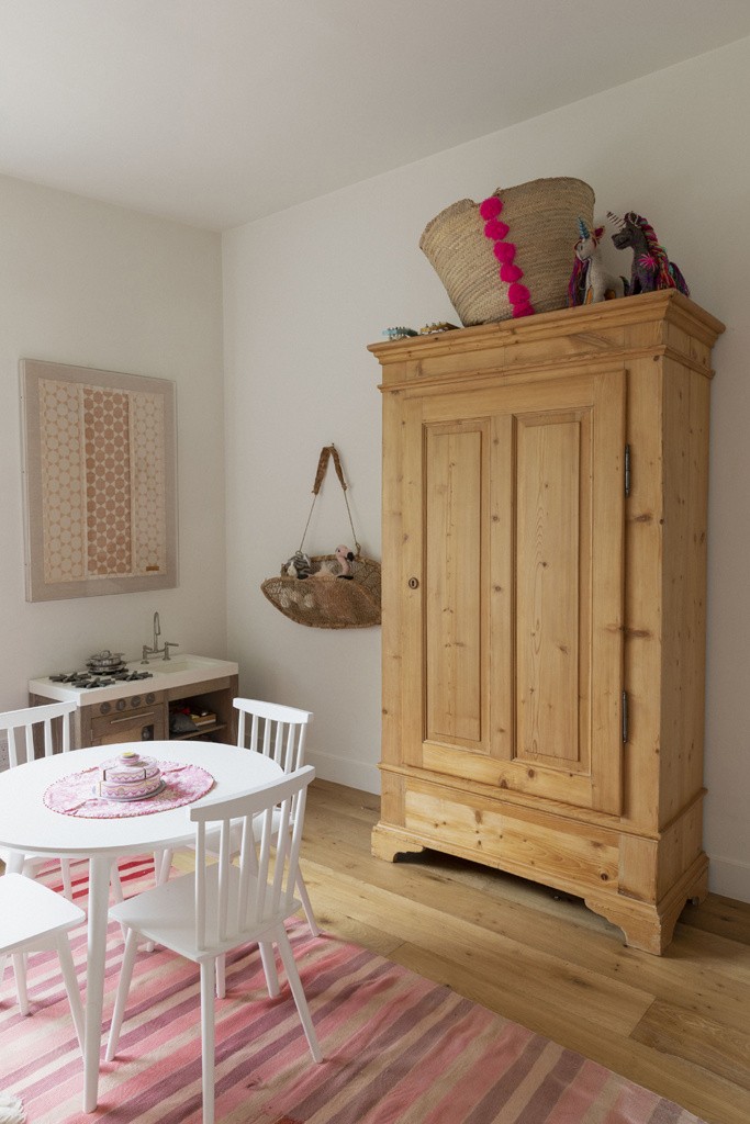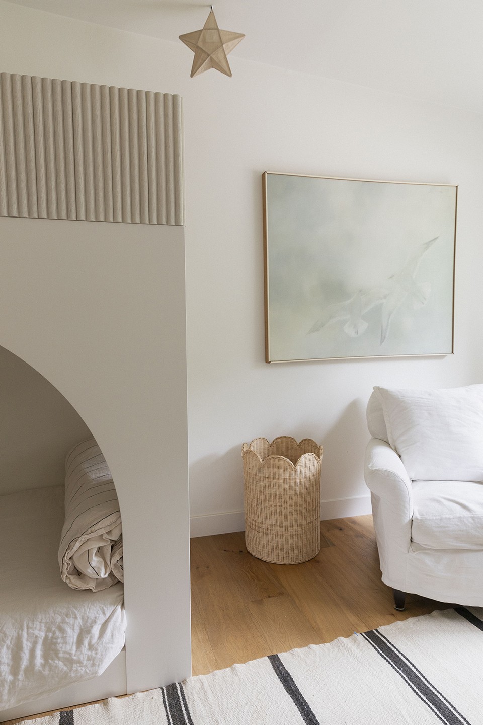 I love this little corner of Elin’s room where we read books, hang out and act as the “audience” whenever there’s a performance (and there’s a lot of them). The painting came from my grandparents house and for years I could never find a good place for it until now. It pulled the room together perfectly and looked so aetherial with the soft chalk wood color on the bunkbed.