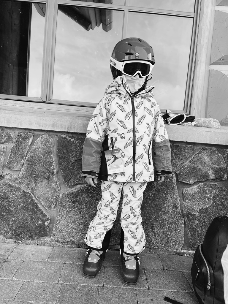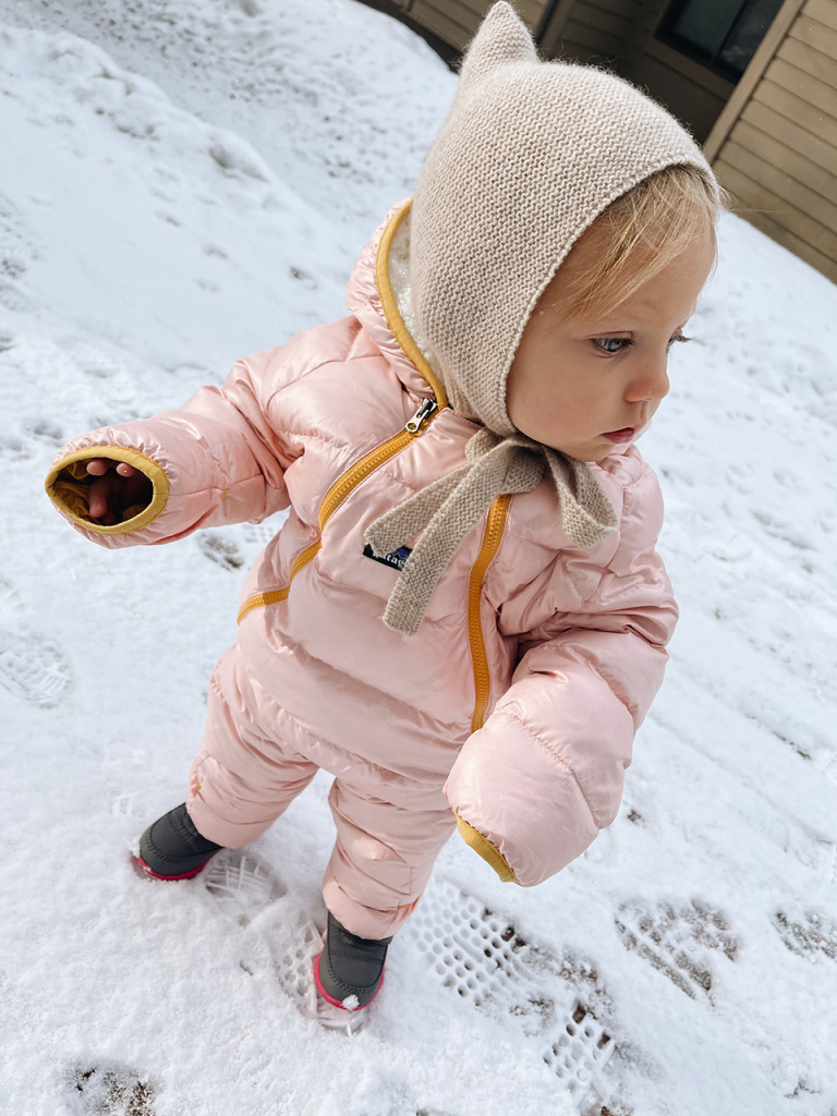 This was Elin’s first time up on skis so I found her the coolest snowsuit getup I could find. Pink with lightening bolts, very much her style these days. Lila loved the snow and lived in a patagonia bunting suit, which was the best money every spent—so warm and easy to get her in and out. Linking everything we wore below…
