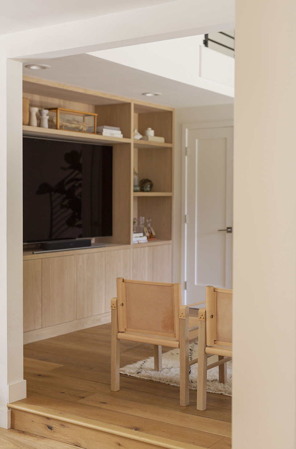 The first time I stepped foot in our home, pre remodel, this was the room that I felt had the most potential. Originally it had a hideous red railing and funky tile floors but the high wood ceilings immediately stole my heart. We knew it would be a space we’d spend a ton of time in and once it was transformed with white oak floors and a new black iron railing it became ten times better. But not until recently when we got to phase two of transforming the space—building out a wall of shelves and a spot for our TV and bringing in lighter furniture—has it felt complete. I walk into the room now and it feels so good and so inviting aesthetically and functionally, exactly what I dreamed of. Here are all the details of the space.
