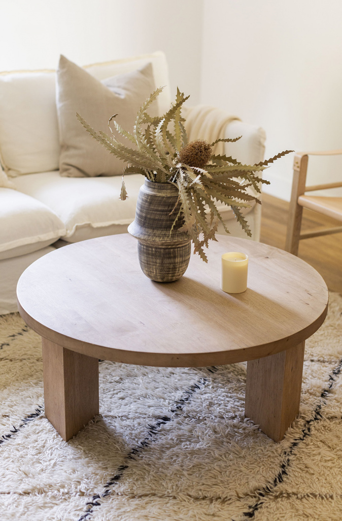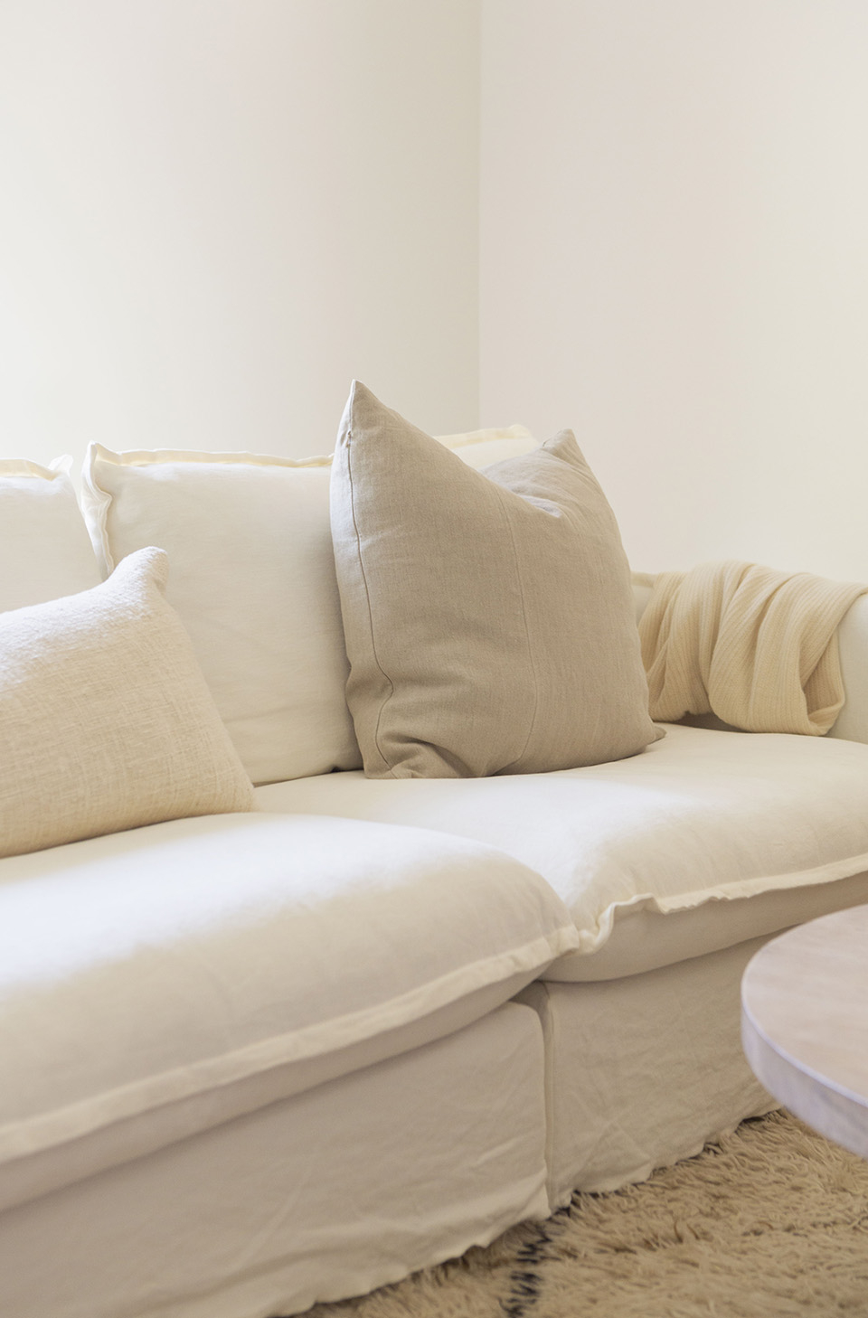 We have been on the search for the perfect sectional couch for this space and when I came across the Sixpenny Neva Chaise Sectional I knew it fit all the criteria we were looking for. The fact that the chaise piece can be moved to the right or left is huge! Especially because we weren’t exactly sure which side would look or work the best in the room—you’d be surprised how the flow of a space can completely change just by moving that piece. With this couch the room feels much cozier (comfort level is beyond!), lighter and brighter since our previous one was a dark blue, more open and overall just more polished. The linen we chose was the light weight linen in Waterlily and we couldn’t be happier as it’s super soft, luxurious feeling and the best white.