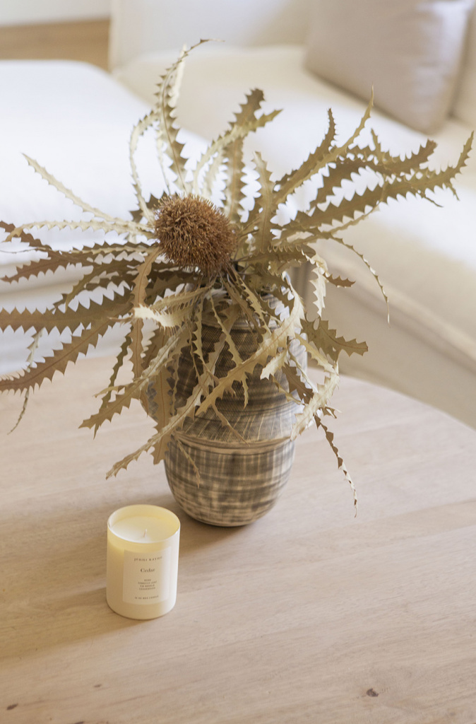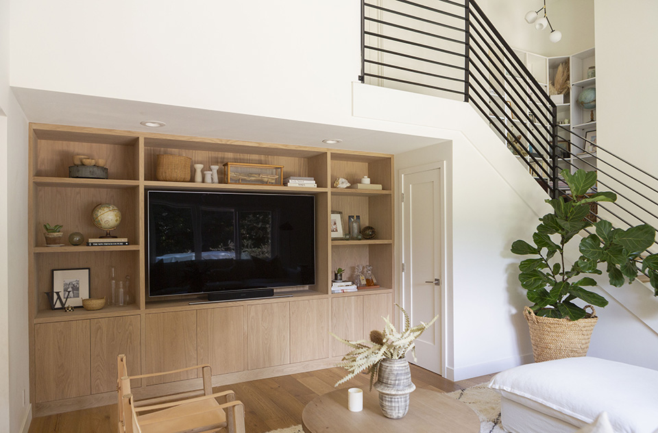 We talked about doing a shelving/media wall since we moved in to make the room feel more polished and to provide more storage and I’m so glad we finally did it. We went with a white oak and designed it so the cabinet doors pop-out instead of having hardware on the outside, which I think gives it a slightly modern yet timeless look. Besides framing our TV I love that there’s a place to put family photos and collected items that all tell a story.