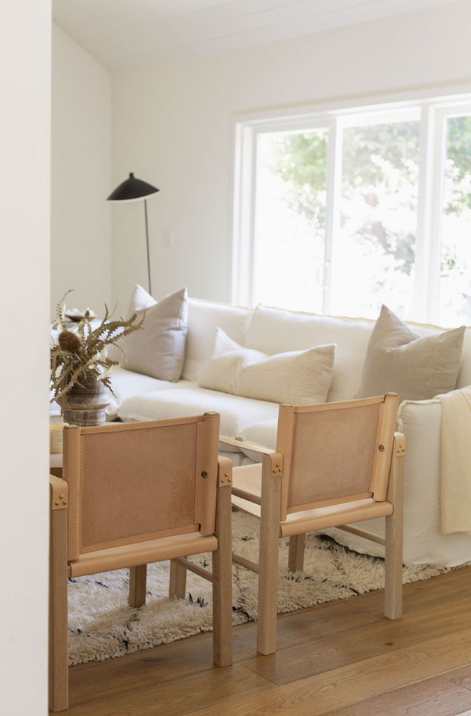 I made a bazillion mood boards over the years for this room and I always came back to leather accent chairs. But so many felt too big or too dark and then I found the Jenni Kayne Safari Chairs and knew they would be perfect for the room. The light tan against the white oak shelving looks better than I ever imagined it would be and the safari style is undeniably timeless.
